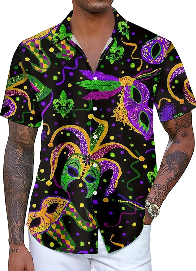 Men's Hawaiian Bowling Shirts for Mardi Gras and St Patricks Day Short Sleeve Button Down Holiday Graphic Shirt