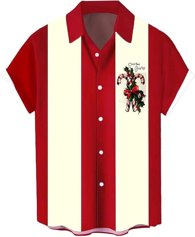 Men's Funny Christmas Shirts Short Sleeve Button Up Vacation Bowling Shirt (S-6XL)