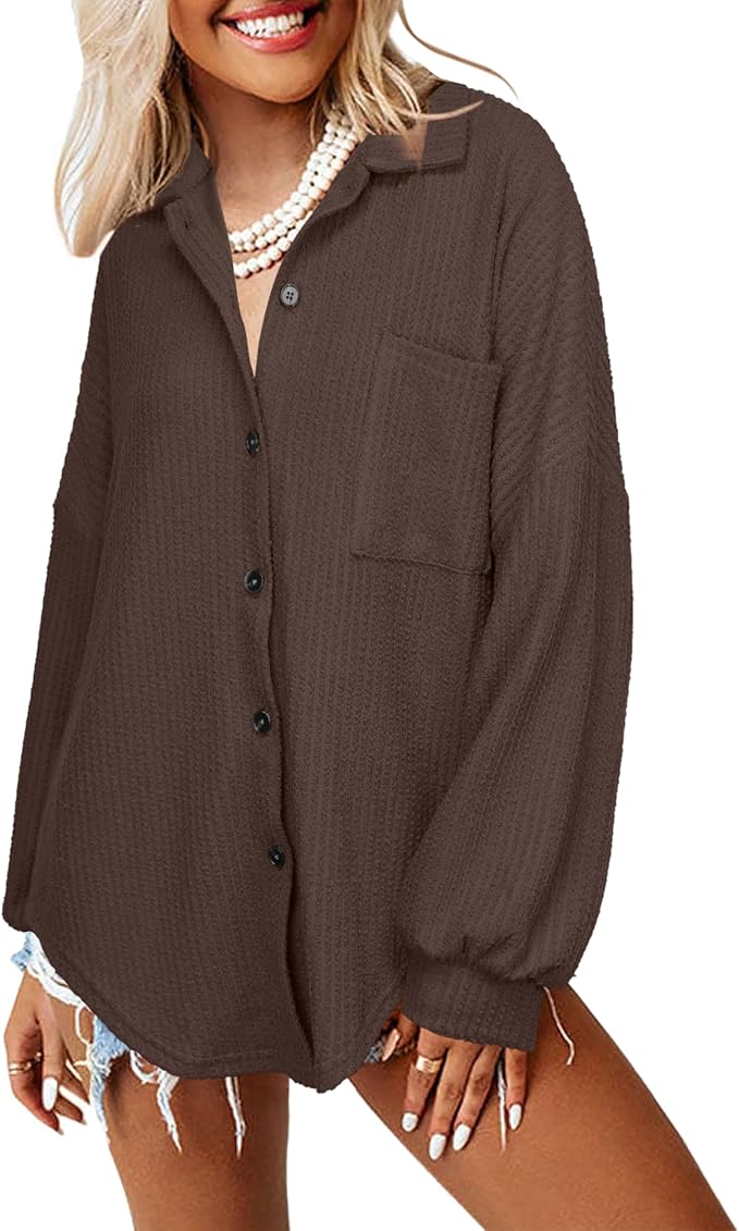 Womens Ribbed Knit Shacket Jacket Casual Long Sleeve Button Down Shirts Dressy Blouses Tops