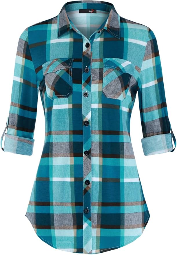 Womens Soft Stretchy Knit Plaid Shirts Roll Up Long Sleeve Collared Button Down Blouses Tops